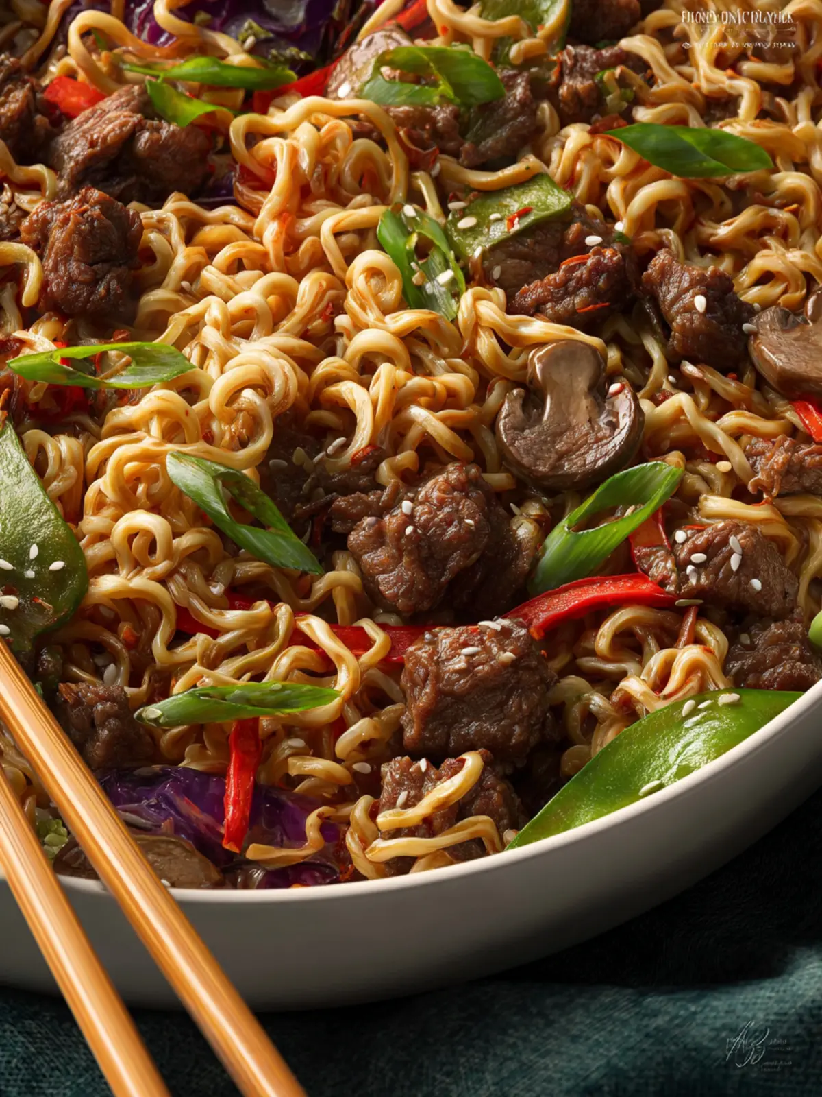 A quick and flavorful ramen stir-fry with ground beef and fresh vegetables.