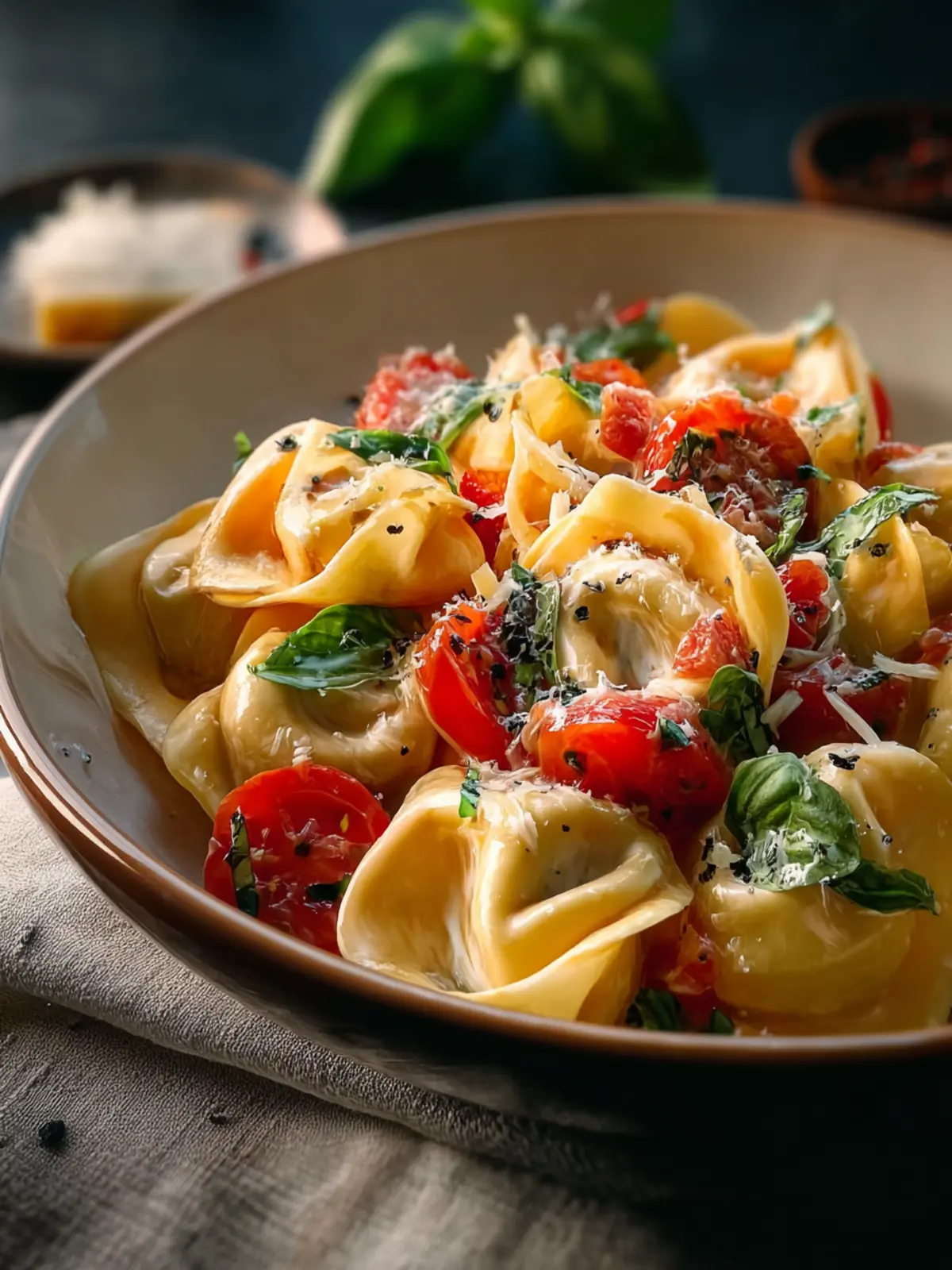 - Toss the cooked tortellini with the creamy tomato sauce until coated. Serve topped with the remaining Parmesan cheese and fresh basil ribbons.