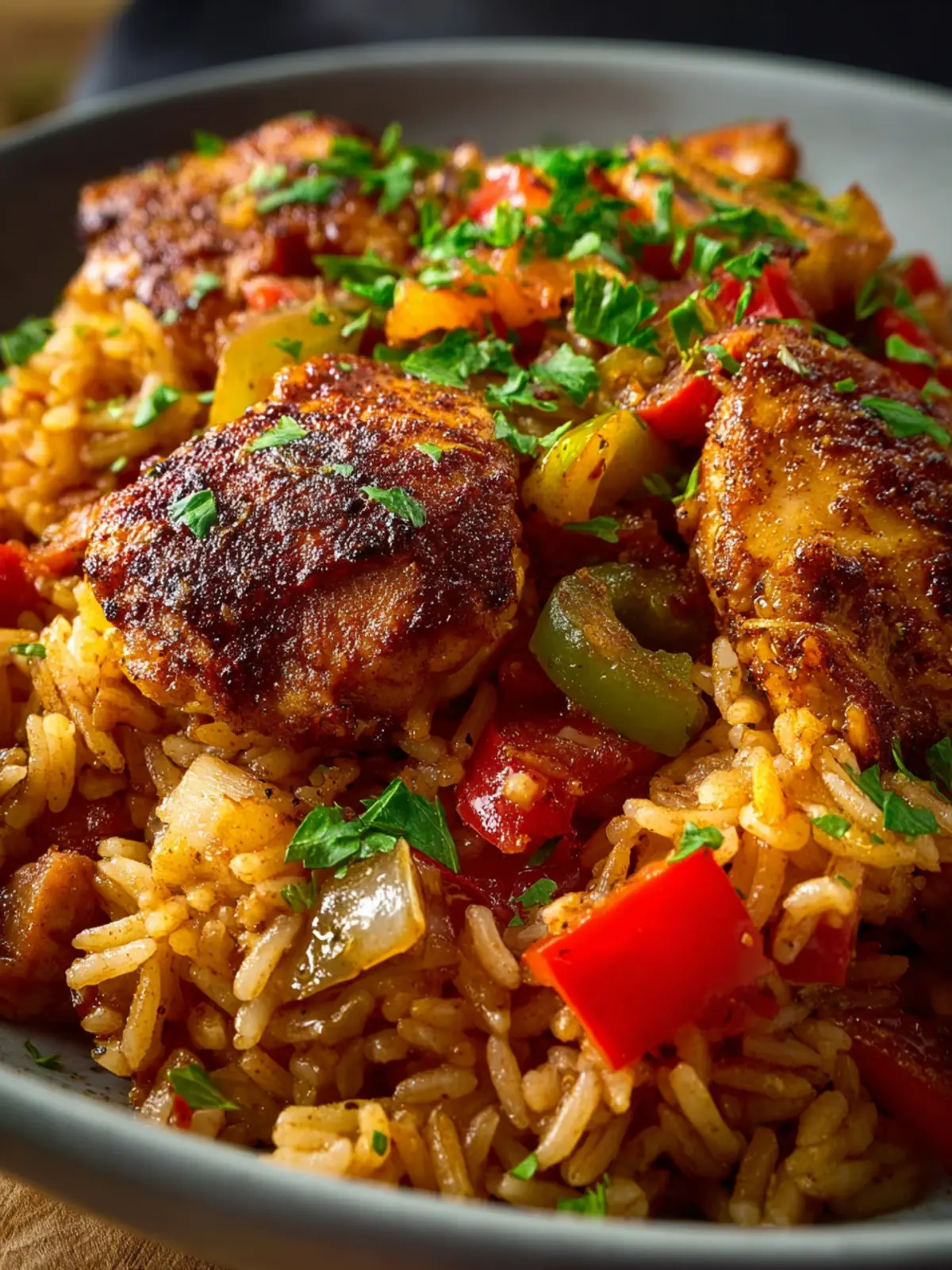 A flavorful and comforting dish featuring tender chicken thighs, savory Cajun spices, and fluffy rice.