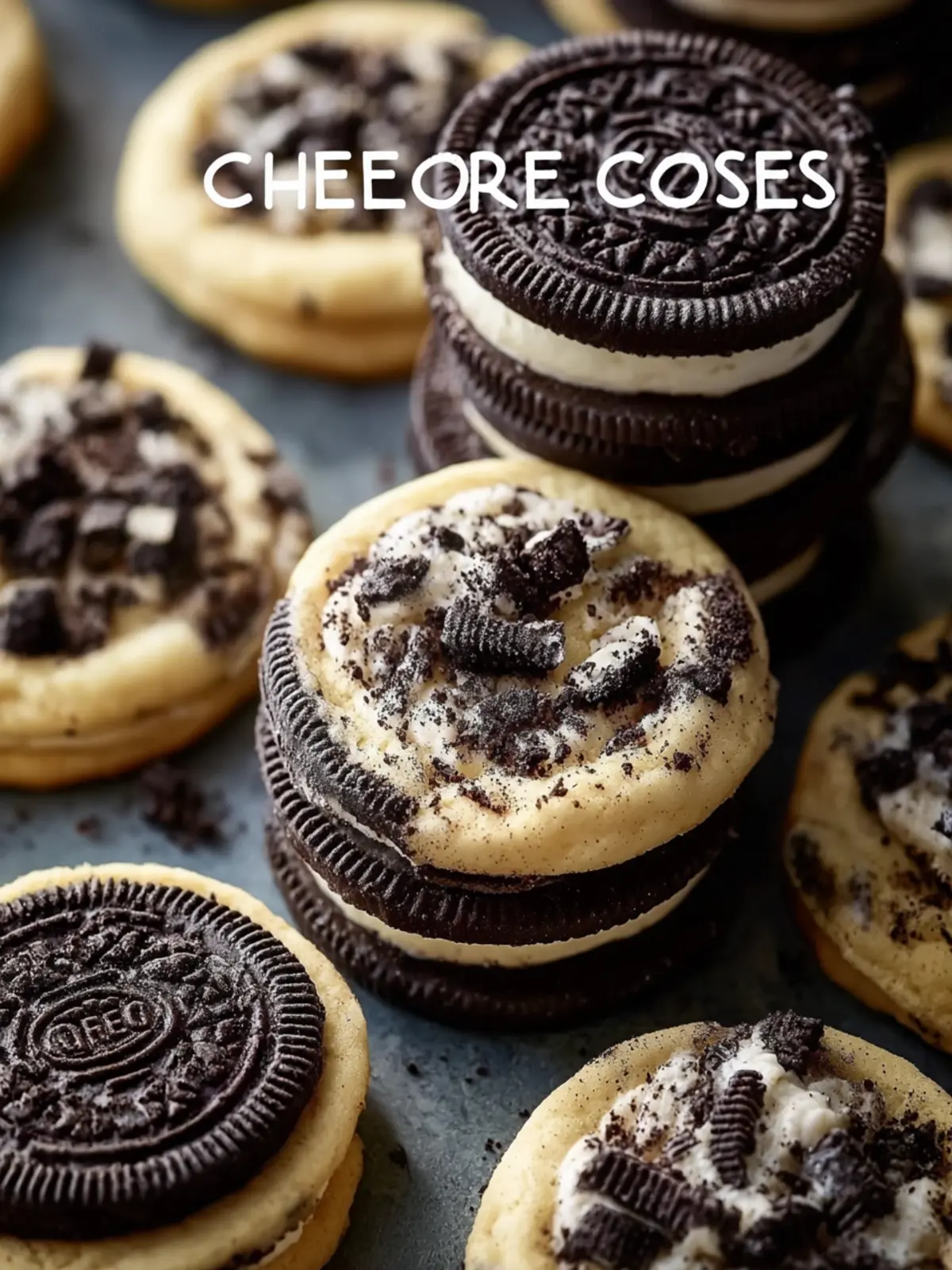 Delicious Oreo cheesecake cookies filled with a creamy cheesecake center and surrounded by a soft cookie dough, topped with additional Oreo pieces.