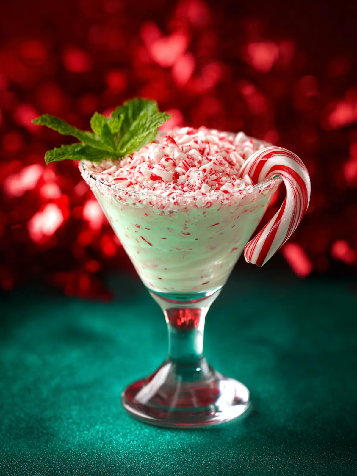 A festive peppermint martini topped with whipped cream and candy cane sprinkles, perfect for holiday celebrations!